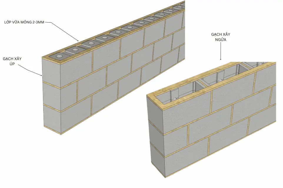 V-Lite blocks allow contractors to customize construction methods according to the specific requirements of each project. With a unique interlocking design, the blocks can be flexibly placed upright or upside-down during installation. This versatility enables tasks such as laying foundations, beams, wall braces, columns, and lintels without using formwork, optimizing the process and significantly reducing material and labor costs.