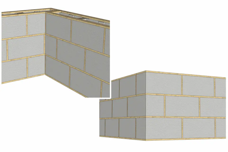 V-Lite wall corners are built by interlocking bricks in a staggered pattern, forming a secure 90-degree angle. This technique ensures not only structural strength but also visual consistency and elegance across the entire wall.
